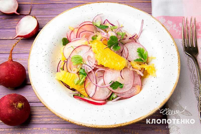 - Редиску нарізати тонкими кружечками, цибулю — півкільцями, апельсин — кубиками, а кінзу дрібно нашаткувати.