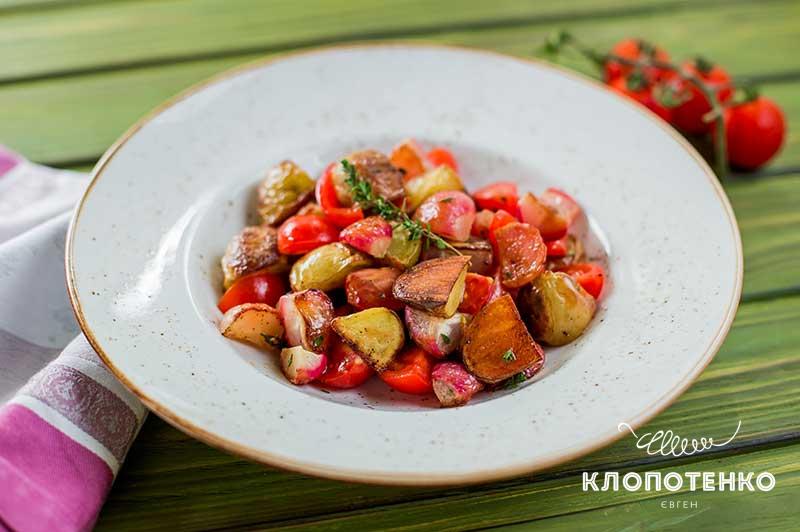 - Викласти овочі на деко, посолити, додати трохи олії, покласти гілочку чебрецю й запікати до готовності картоплі при 180 градусах.