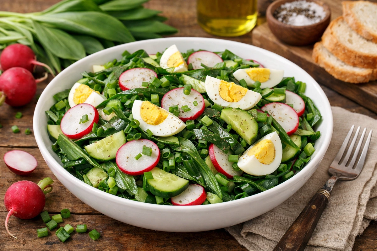 - Листя черемші та зелену цибулю промити, висушити та дрібно нарізати.