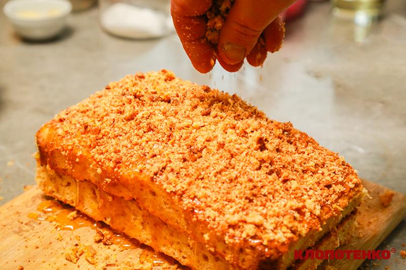- Зверху прикрасити медовий пляцок крихтою від тіста та дати стабілізуватися у холодильнику хоча б годину.