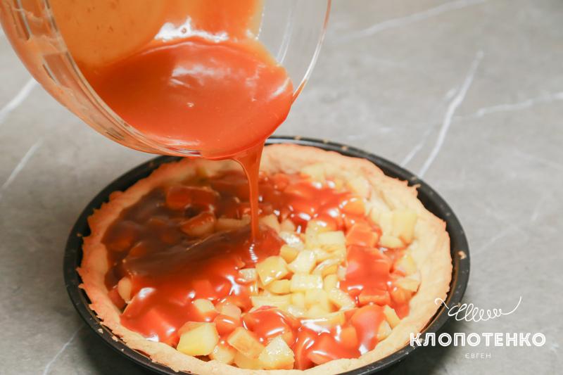 - Зверху на тарт вилити карамель та розрівняти начинку.